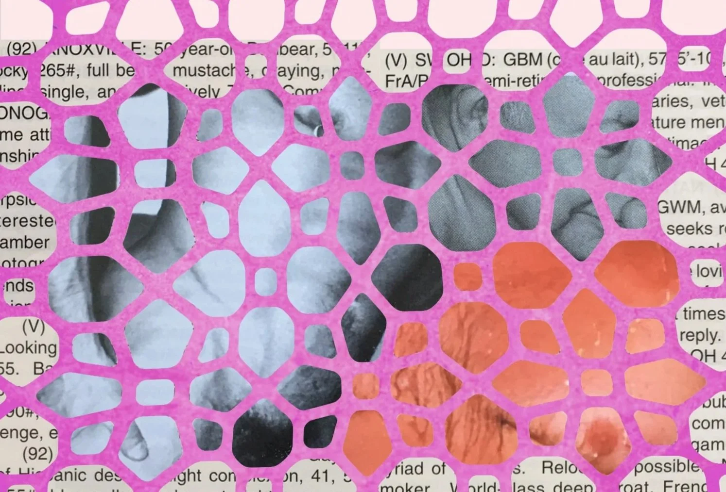 SHYBEAR almost exclusively utilized found color, image, and texture, barely changing or adjusting them for aesthetic purposes. Scrawled on the back of collage #2, he wrote, “[t]hese things are poems or stories, and like poems or stories, I am just putting together pieces of existing materials.” SHYBEAR saw his use of collage as a form of poetry and writing in and of itself, placing images and text together to craft new contexts for them to exist within.